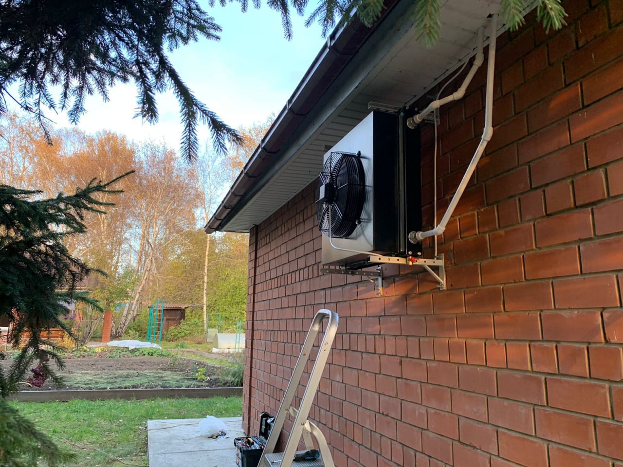 Является безальтернативным вариантом охлаждение майнинг-оборудования в местах, где нет доступа к источнику холодной воды. Этот тип охлаждения предполагает как постоянное 100%-ное, так и частичное отведение тепла, например, для обогрева теплиц, разведения рыб, бассейна, отопления дома. При излишках тепловой энергии даже после передачи части тепла его потребителям (бассейн, отопление дома и т.п.), остаток тепловой энергии может быть рассеян с помощью сухого охладителя, что предотвратит перегрев оборудования. Вся необходимая обвязка оборудования поставляются в комплекте, в том числе и для градирни. Со стороны заказчика требуется лишь подвести питающий кабель на электрический щит изделия, а также сделать монтаж труб между ячейкой и сухим охладителем.